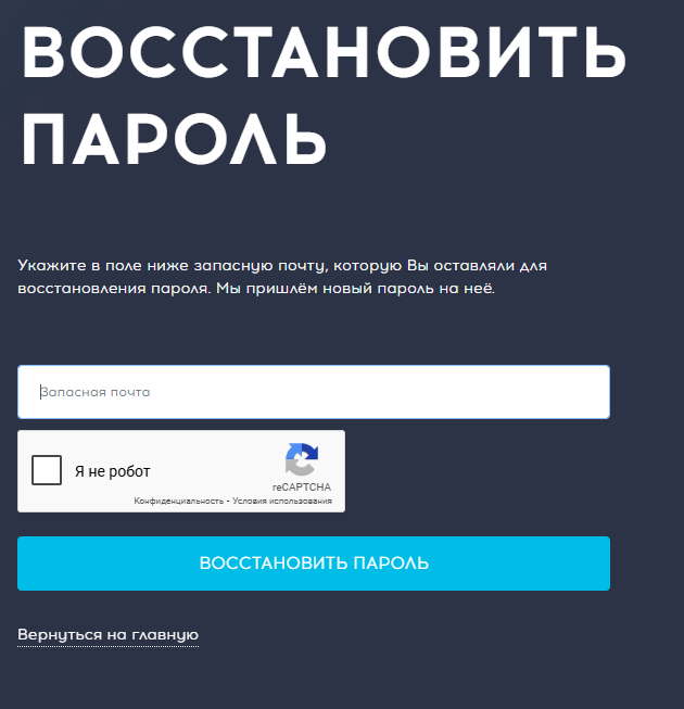 ввести в поле адрес своей запасной почты, на неё придет письмо со ссылкой для установки пароля, нажать кнопку "Восстановить пароль".