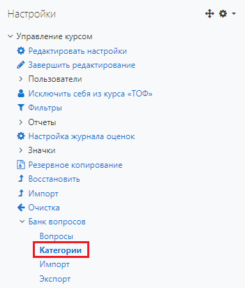 1. Чтобы создать категорию вопросов, зайдите в "Настройки" - "Управление курсом" - "Банк вопросов" - "Категории".