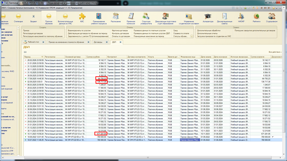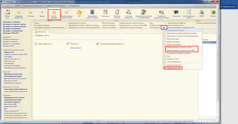 В начале рабочего дня необходимы выявить все несоответствия информации по договорам на платное оказание услуг, которая содержится в базах 1С:Учебный процесс и 1С:Университет.