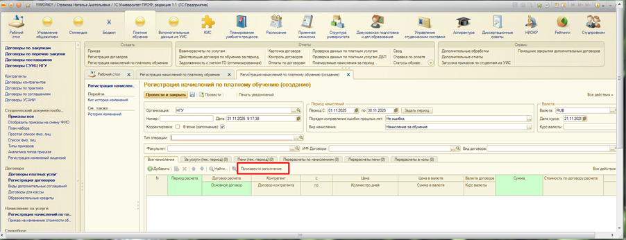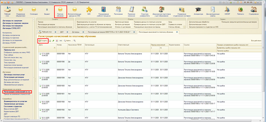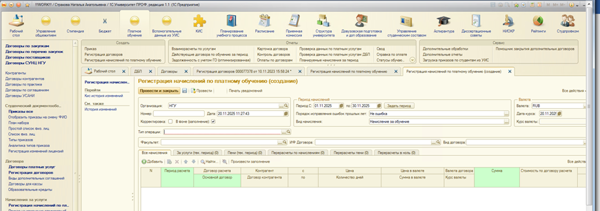 Путь: База Университет -> Платное обучение -> Начисления за услуги. Регистрация начислений по платному обучению.