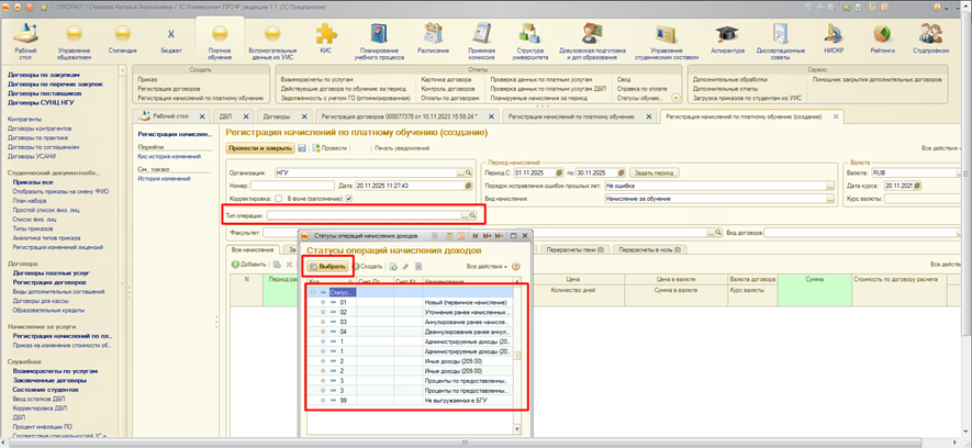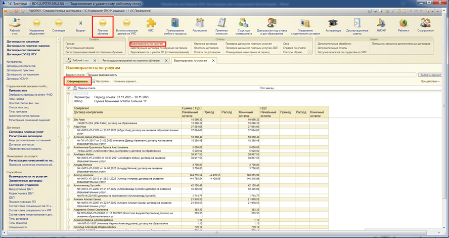 Путь: База Университет -> Платное обучение -> Взаиморасчеты по услугам