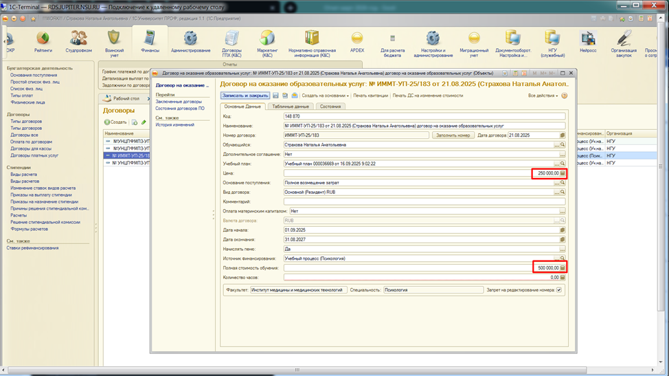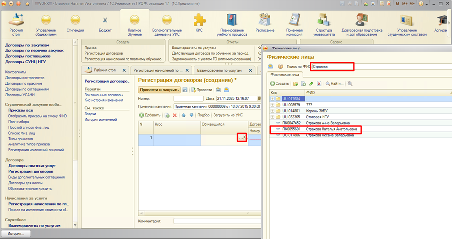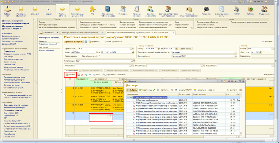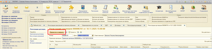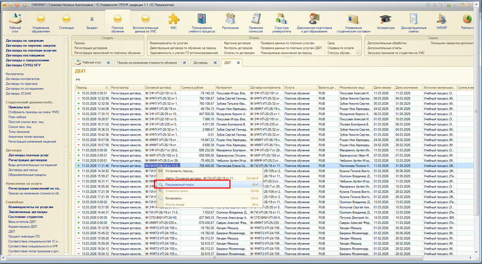 Путь: База Университет -> Платное обучение -> Договора. Регистрация договоров