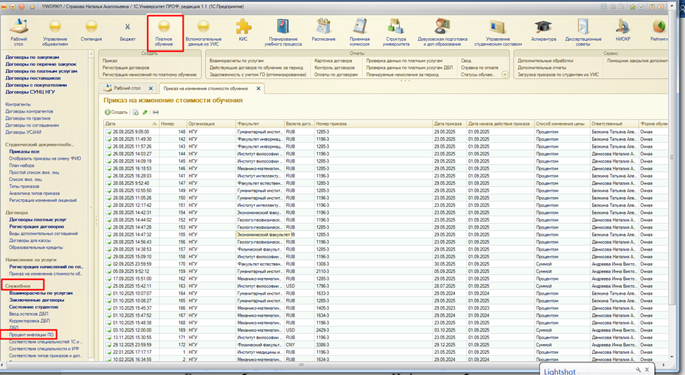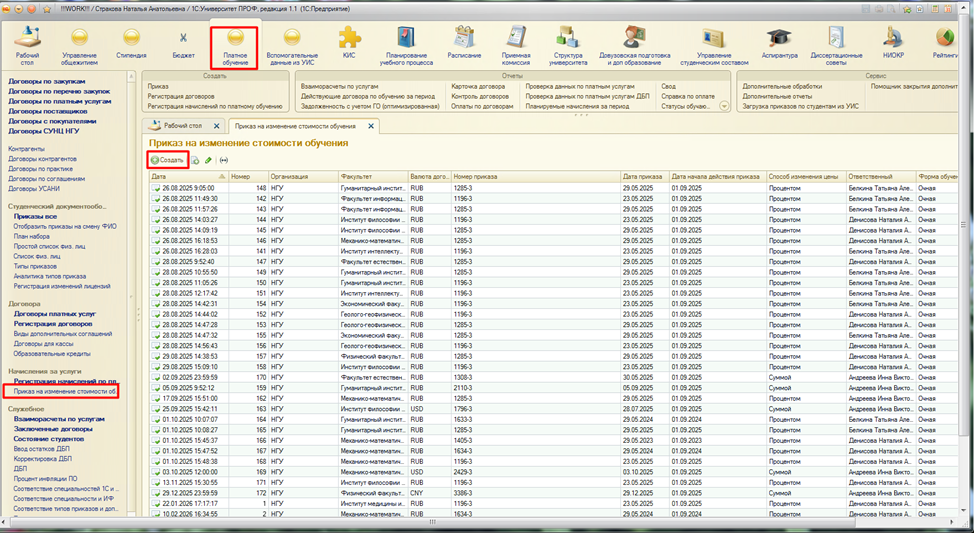 Путь: База Университет -> Платное обучение -> Начисления за услуги. Приказ на изменение стоимости.