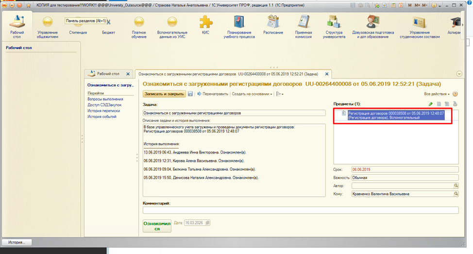 4.2.При получении задачи по договору/ДС, связанному с поступлением Обучающегося необходимо проверить правильность оформления договора/ДС, а также правильность формирования записей в журнале «Доходы будущих периодов», после чего запустить команду «Ознакомиться».