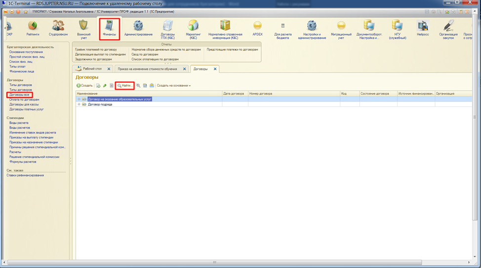 Путь к списку всех договоров и ДС: База Учебный процесс -> Финансы -> Договоры. Договоры все