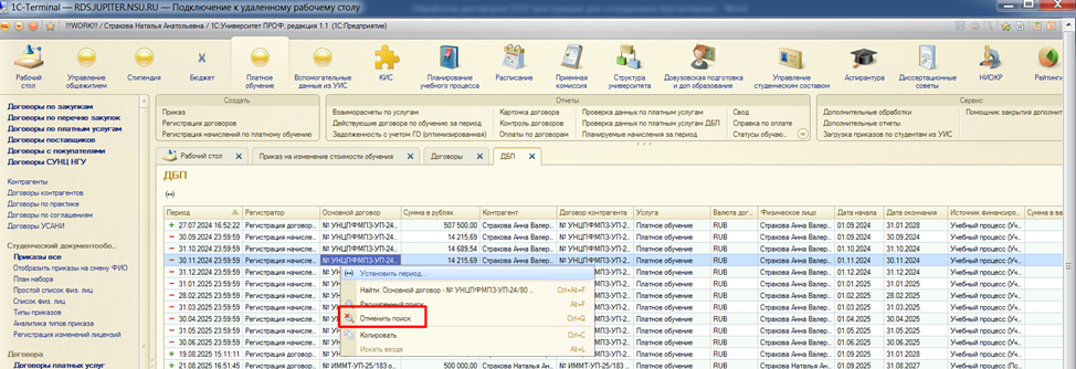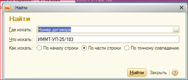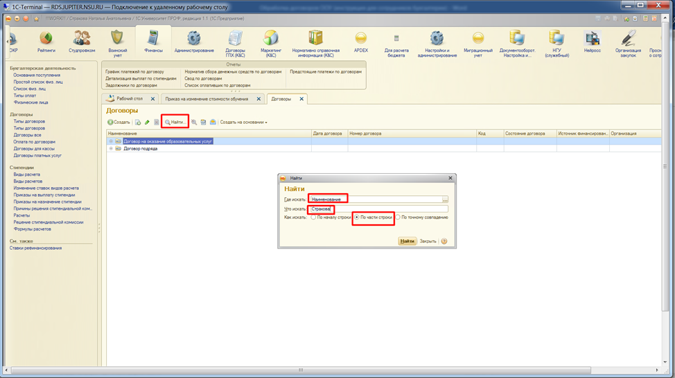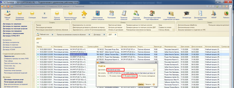 По команде «Найти», можно отобрать все договоры, относящиеся к Обучающемуся. Для этого необходимо в окне поиска выбрать «Наименование», перевести режим поиска в «По части строки» и ввести в поисковую строку часть или полную фамилию Обучающегося.