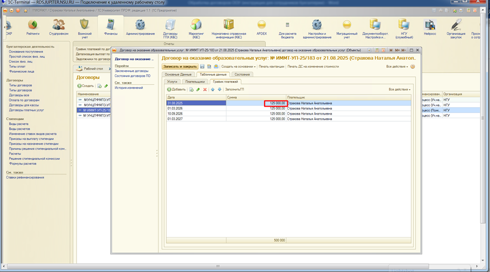 После заполнения «Графика платежей» вернуться на вкладку «Основные данные», записать и закрыть ДС.
