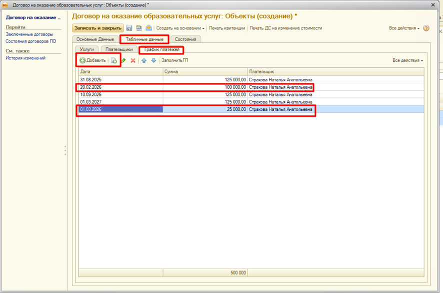 В разделе «График платежей» расписать этапы оплаты за семестр материнским капиталом и собственными средствами. Дата – дата планируемого поступления средств. Строчки в табличной части «График платежей» добавлять по кнопке «Добавить» или «Копировать».