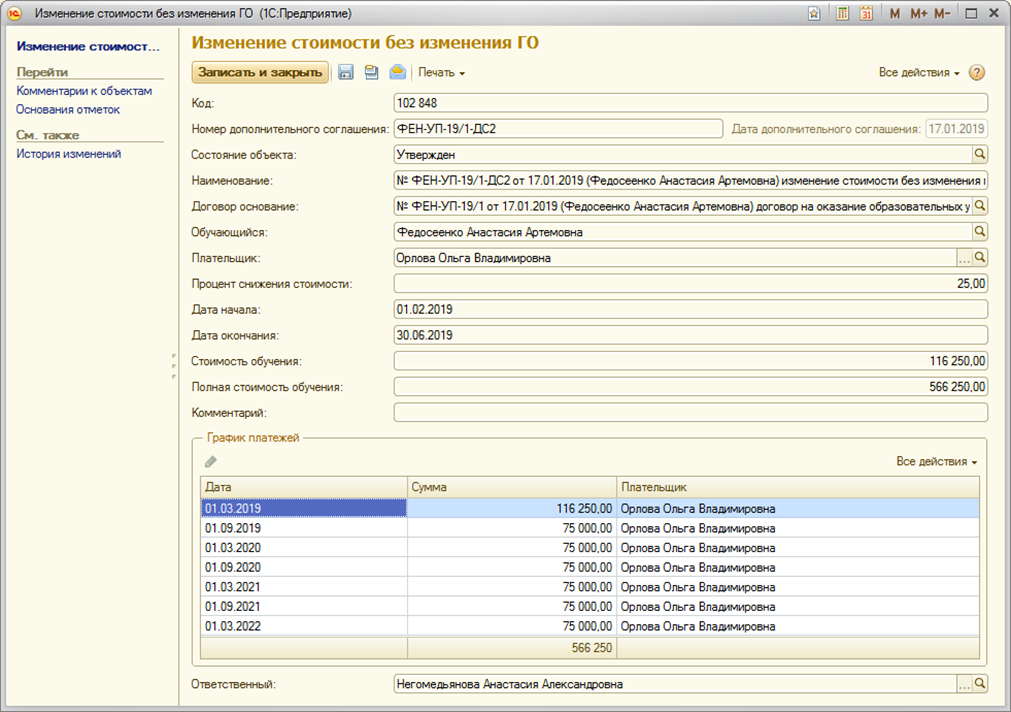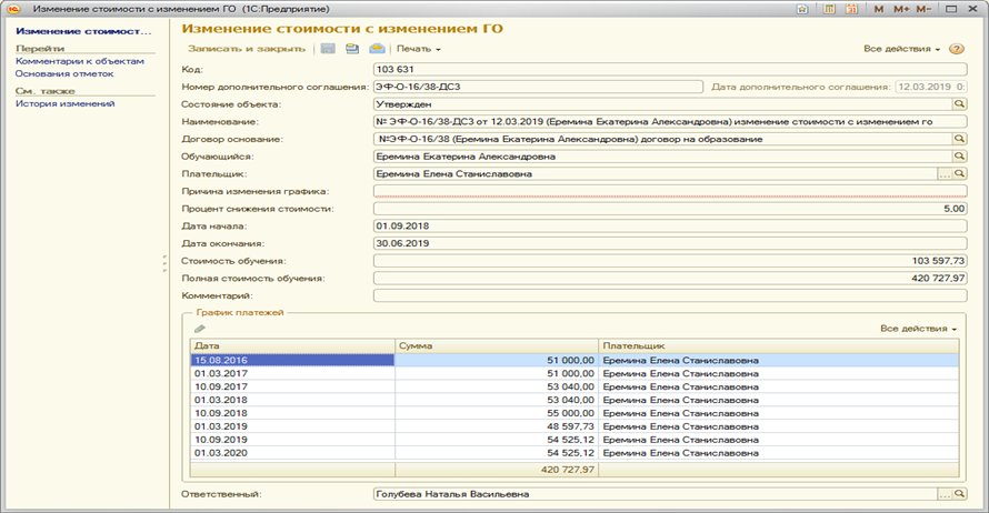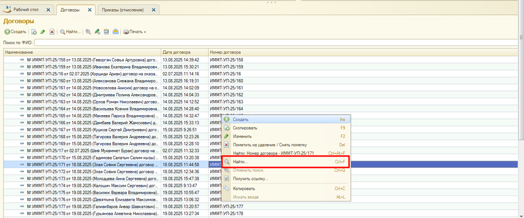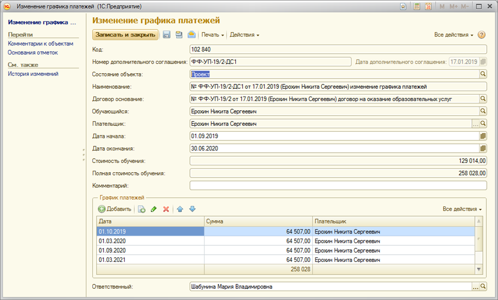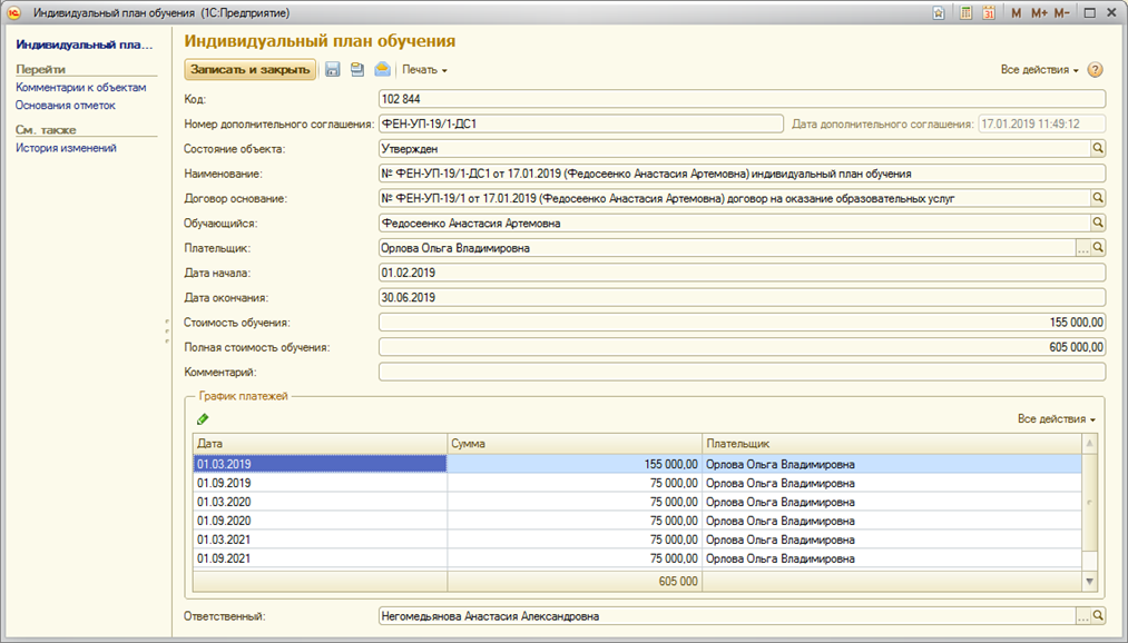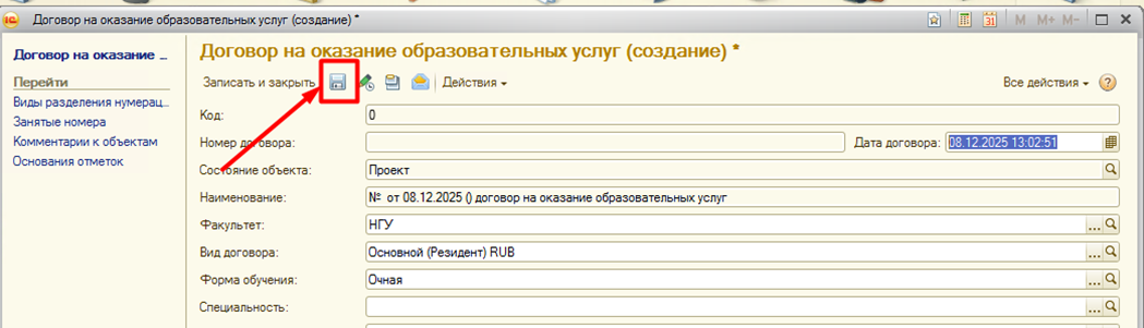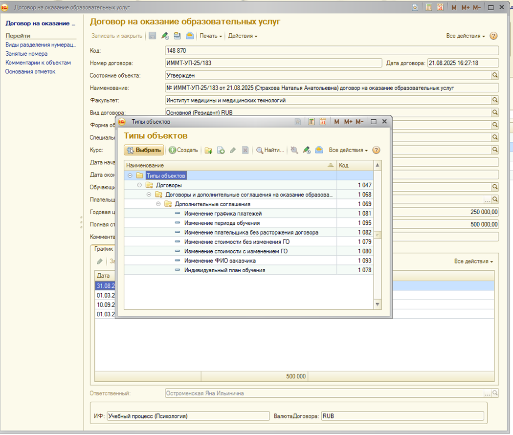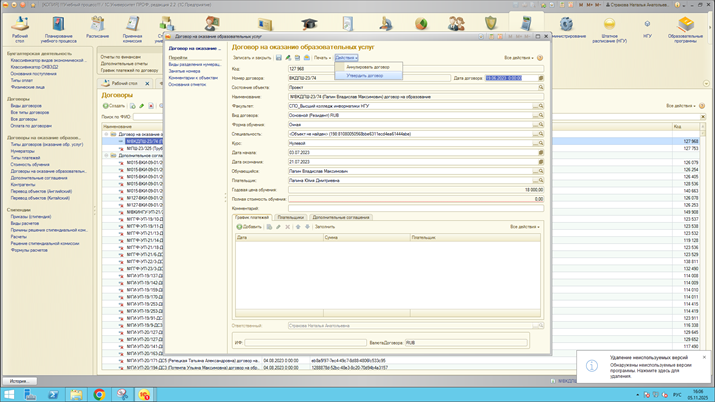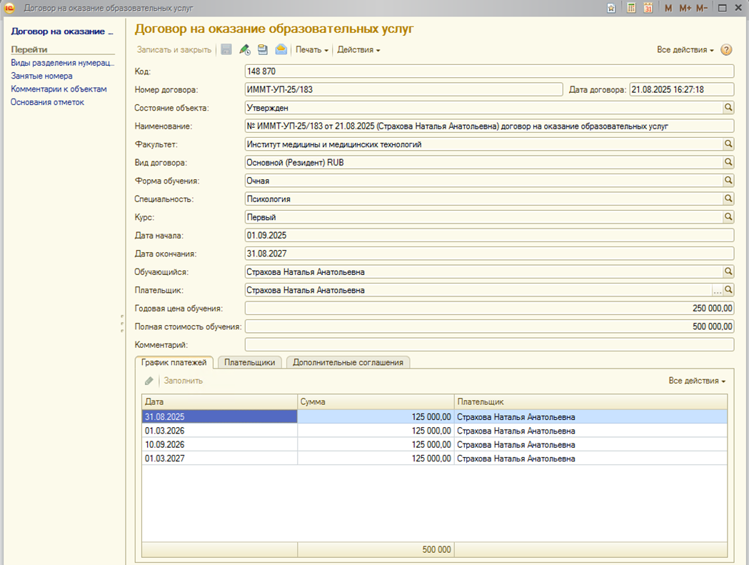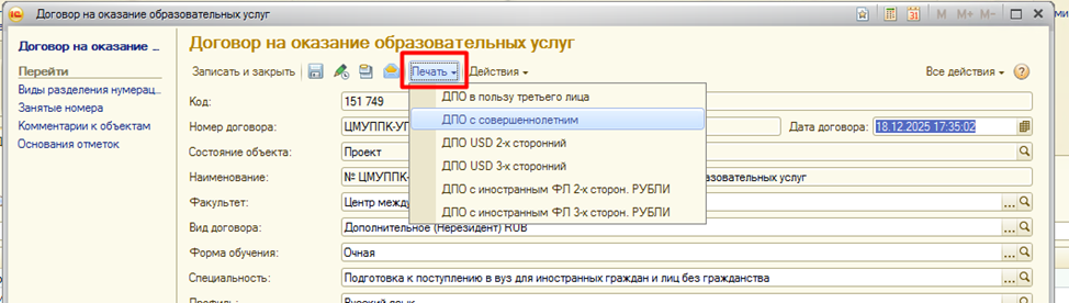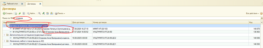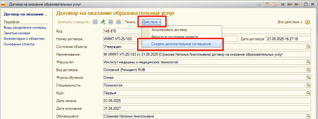 Страница: Работа с договорами на оказание основных образовательных услуг (Основное обучение) и дополнительными соглашениями к ним в блоке информационной базы 1С:Учебный процесс, заключаемых вне приемной кампании.
