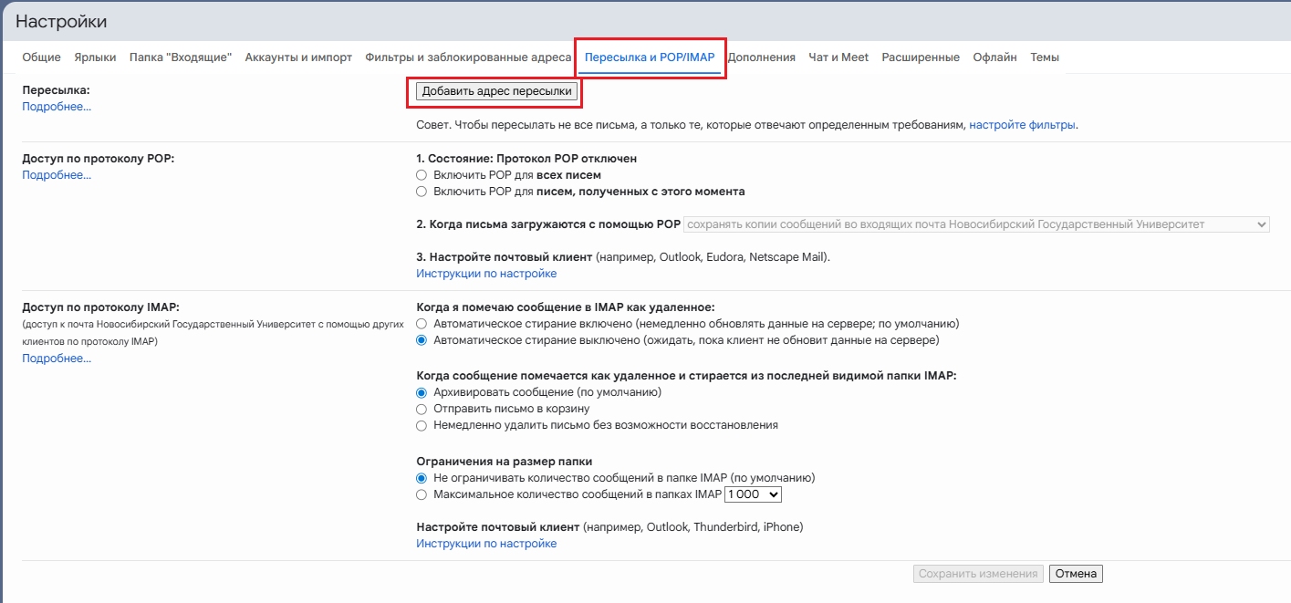 - Перейти во вкладку Пересылка POP/IMAP и нажать кнопку Добавить адрес пересылки.