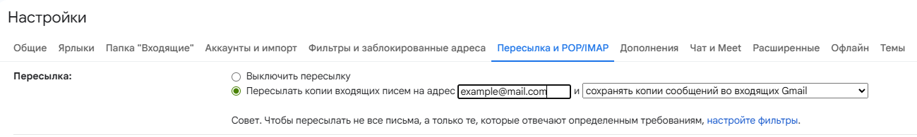 После этого снова зайдите в настройки (п.1 инструкции) и выберите Пересылать копии входящих сообщений на адрес и в выпадающем меню выберите действия со входящими письмами в Google.