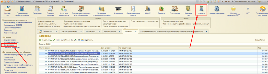 Поиск договора выполняется либо по ФИО Обучающегося,