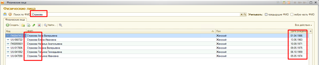 При вводе в поисковой строке части фамилии происходит подбор всех физических лиц, содержащих ее. В списке сразу видна дата рождения. Для проверки паспортных данных необходимо открыть карточку физического лица.
