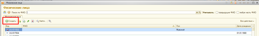 Если «Физическое лицо» в базе не найдено, необходимо создать новое «Физическое лицо» по команде «Создать».