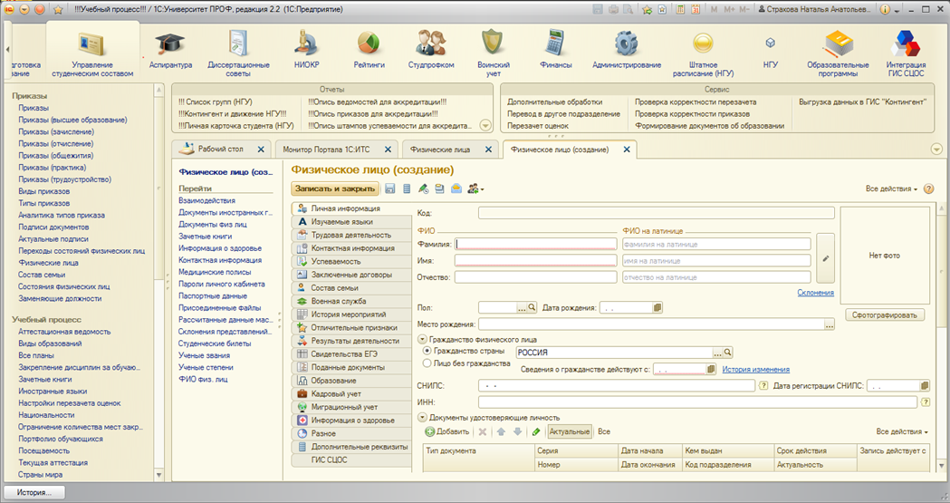 Если физическое лицо уже есть в базе 1С «Учебный процесс», нужно войти в его карточку и проверить данные. При обнаружении расхождения, необходимо исправить некорректные данные. Если Обучающийся является сотрудником НГУ и выдается сообщение о невозможности изменить данные физического лица-сотрудника, заключение договора должно быть приостановлено. Сотрудник должен обратиться к специалисту управления кадров для приведения в данных в соответствии с предоставленными документами. К заключению договора нужно вернуться после обновления данных в базе.