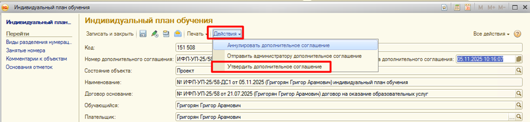 После этого по кнопке «Действия» необходимо утвердить договор.