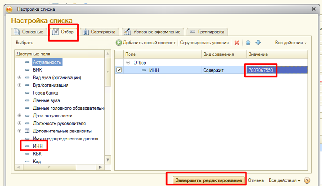 В открывшемся окне выбрать закладку «Отбор», два раза кликнуть левой кнопкой мыши по ИНН в левой таблице, и оно появится в правой. Ввести ИНН в поле «Значение» и нажать «Завершить редактирование».