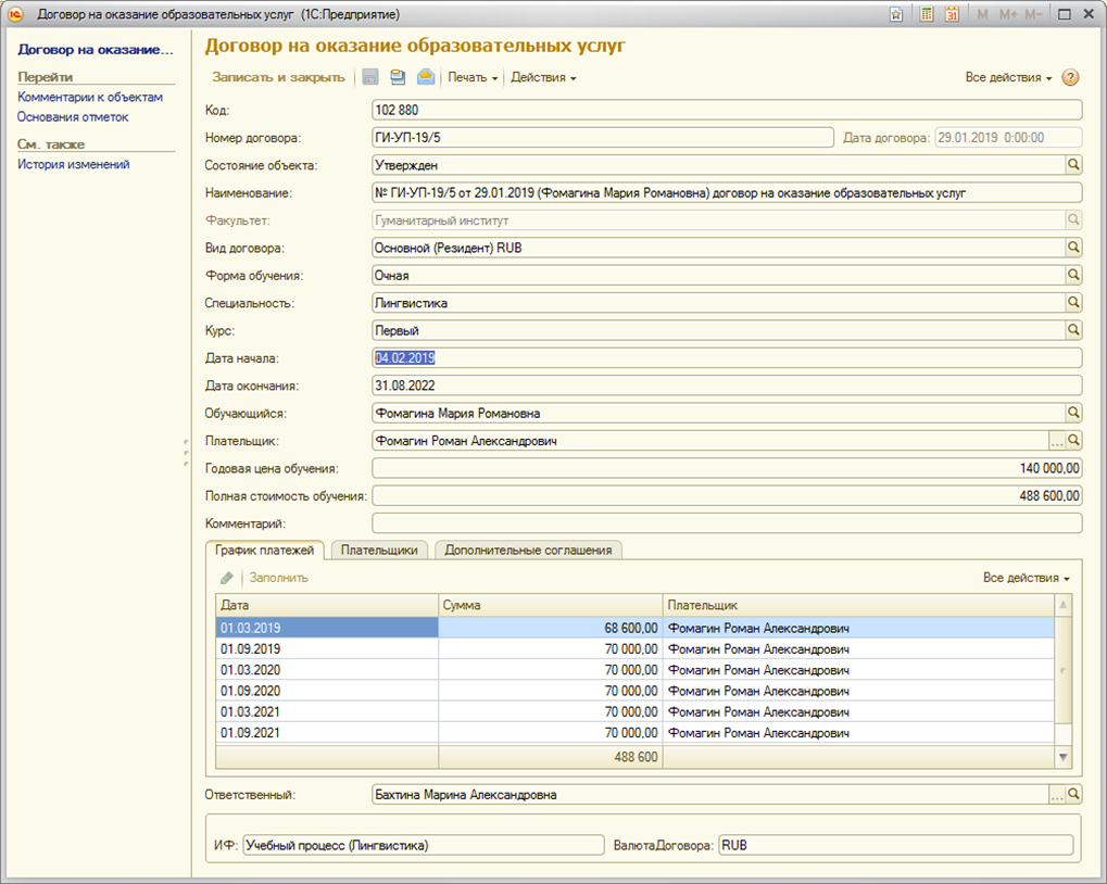 Изменение графика платежей можно делать только в рамках одного учебного года, не более, чем на два семестра. При заполнении ДС необходимо контролировать итоговые суммы в ГО и суммы в договоре «Полная стоимость обучения».